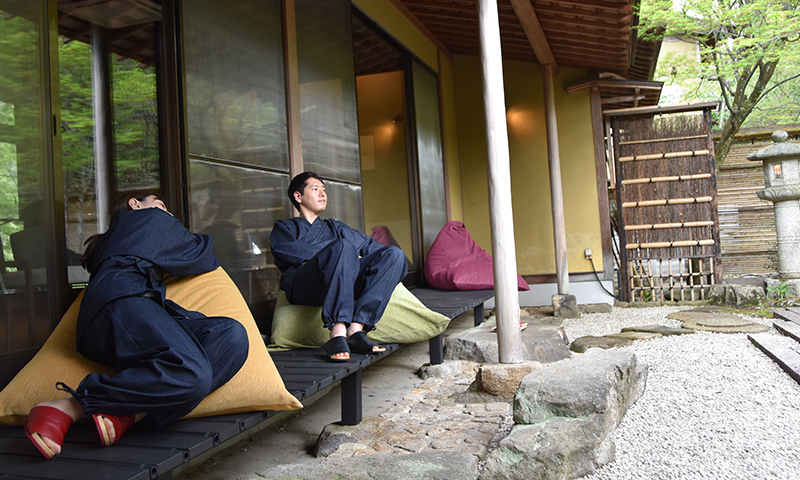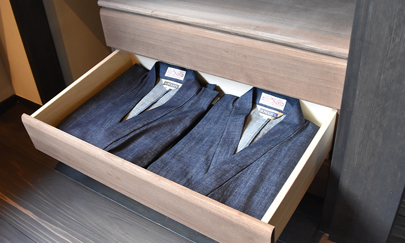 滞在中にゲストが最も長い時間を共に過ごす「衣」についても、この確かな審美眼によって選び抜かれたのが、和粋庵の「カイハラデニム・ピマ綿作務衣」でした。